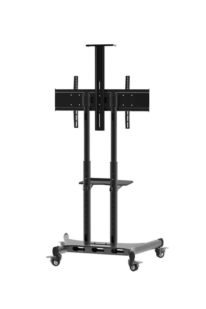 Wave PRO Lattiateline, 40-90″ max 90Kg Liikuteltava lattiateline. Sopii 40″ – 90″ näytöille max. 90kg. Telineen mitat 1000x680x2300mm. Säädettävä korkeus 1150-1650mm. Säädettävä VESA (100-800) x (100-500) mm. Kaapelikouru. Kamerahylly 256x320mm.Toimitetaan 75mm lukittavilla pyörillä. Telineenpyörät täyttävät ISO 22881-2004 normin.